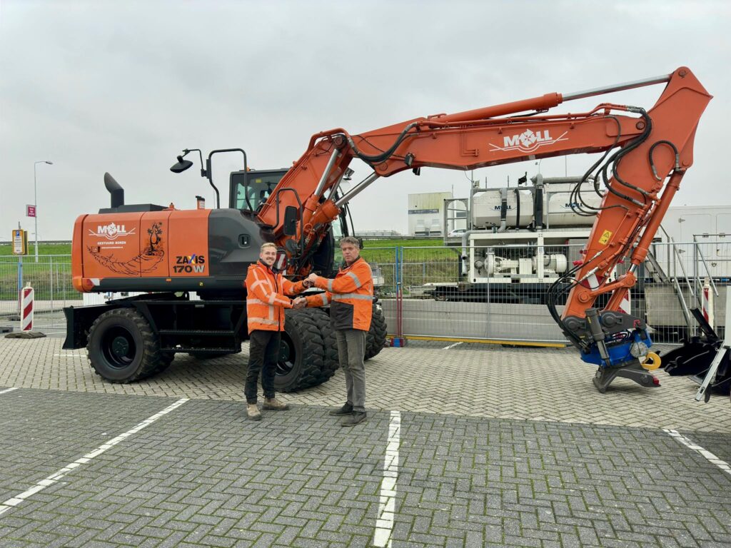 Deze kraan is uitgerust met een draaikantelstuk en is compleet met bakkenset – direct klaar ter ondersteuning voor een gestuurde boring in Zaandam